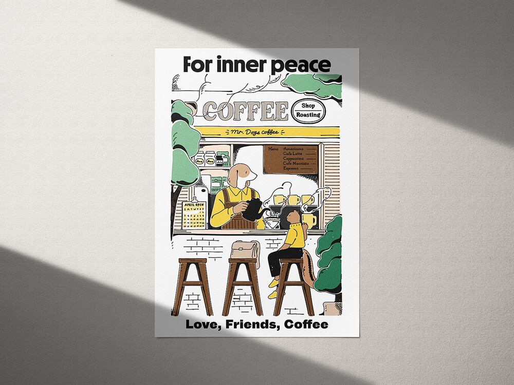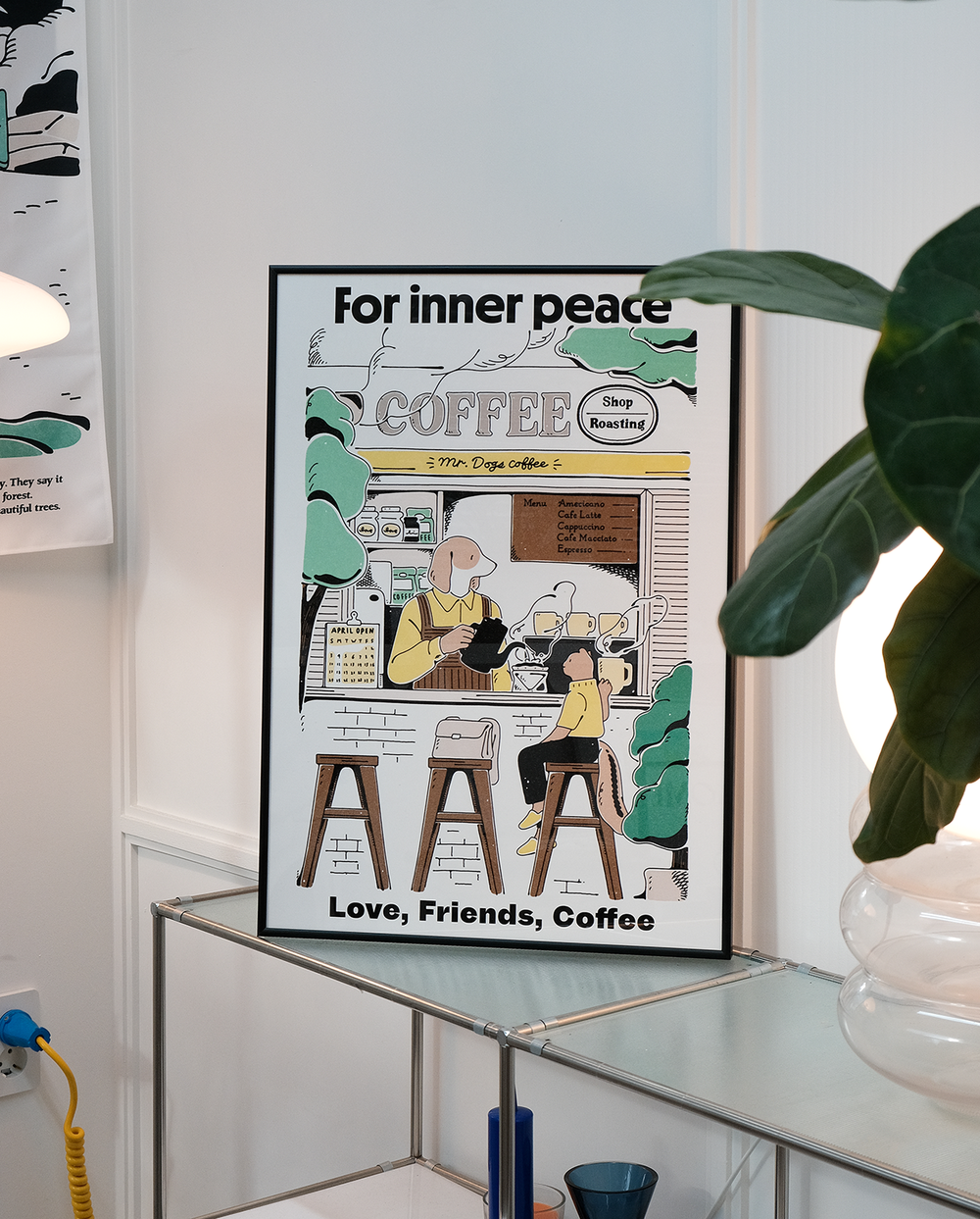 오랜 친구인 주인공들은 마음의 평화를 찾는 법이 비교적 간단합니다. 좋아하는 친구와 커피 한 잔. 조금 더 자세히 들여다보면 강아지는 친구에게 직접 드립커피를 내려주는 것, 다람쥐는 친구와 깊은 대화를 나누고 집에서 마실 원두를 사는 것까지 이어집니다. 마음의 평화는 생각보다 멀리있지 않습니다.