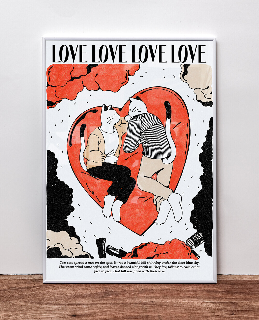 “What about here?” “Looks great” Two cats spread a mat on the spot.It was a beautiful hill shinning under the clear blue sky. The warm wind came softly, and leaves danced along with it. They lay, talking to each other face to face. That hill was filled with their love.