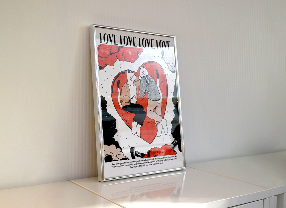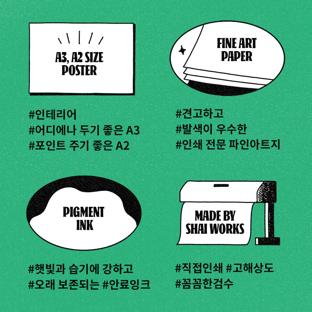 포인트컬러가 있는 담백한 무드의 일러스트 포스터입니다. 어디에 두느냐에 따라 공간의 포인트가 될 수도, 공간의 일부가 될 수도 있습니다. 액자에 넣어 포인트가 필요한 바닥에 기대어 세워두거나, 벽에 걸기 좋습니다. 마스킹테이프를 활용해 벽에 붙이기에도 좋은 중량의 종이로 활용하기 좋습니다. 특히 블랙컬러의 액자가 잘 어울립니다.