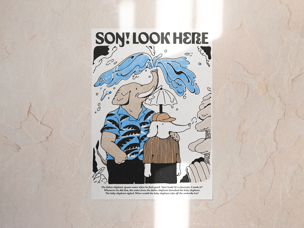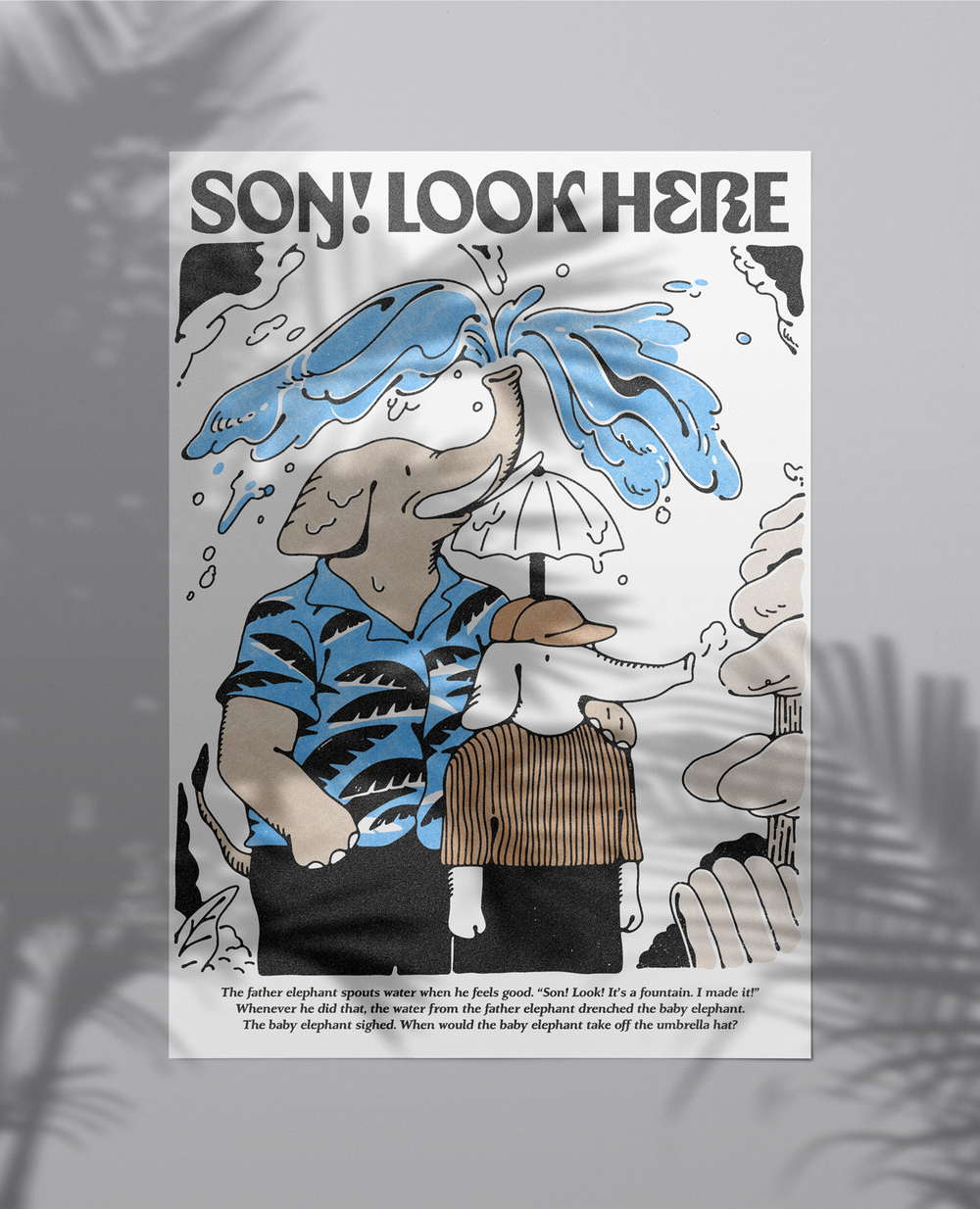 The father elephant spouts water when he feels good. “Son! Look! It’s a fountain. I made it!” Whenever he did that, the water from the father elephant drenched the baby elephant. The baby elephant sighed. When would the baby elephant take off the umbrella hat? When would he be able to spout water like his father?