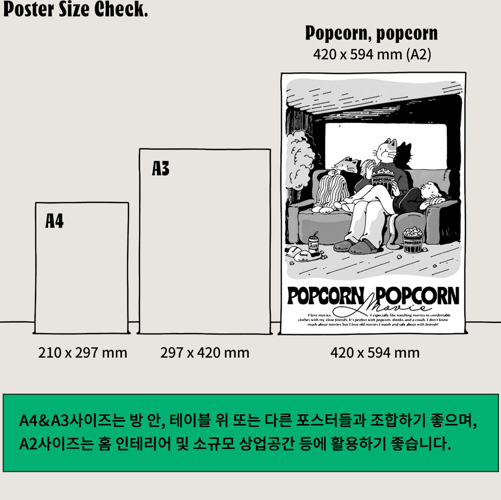 액자에 넣어 포인트가 필요한 바닥에 기대어 세워두거나, 벽에 걸기 좋습니다. 마스킹테이프 등으로 벽에 부착하기 적당한 중량의 종이로 활용하기 좋습니다.