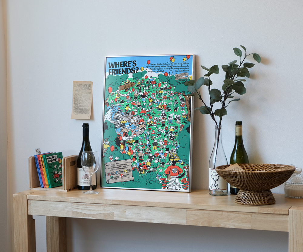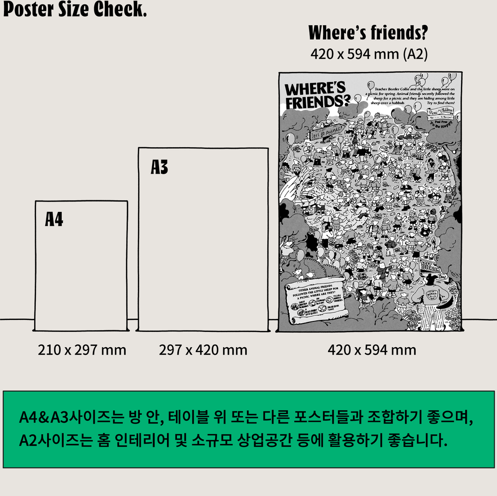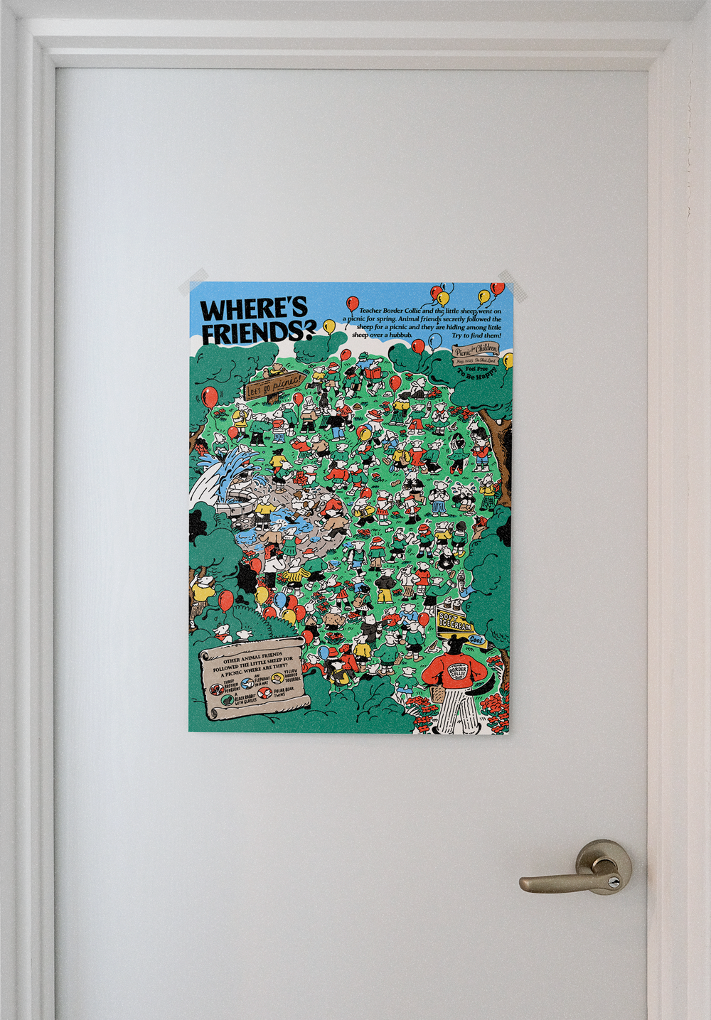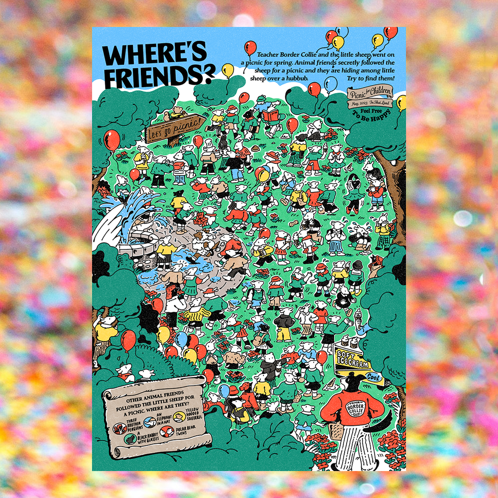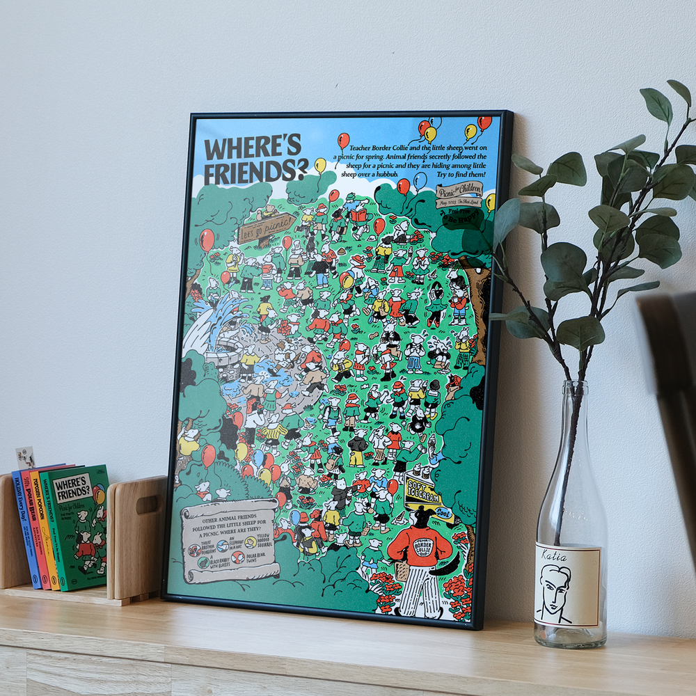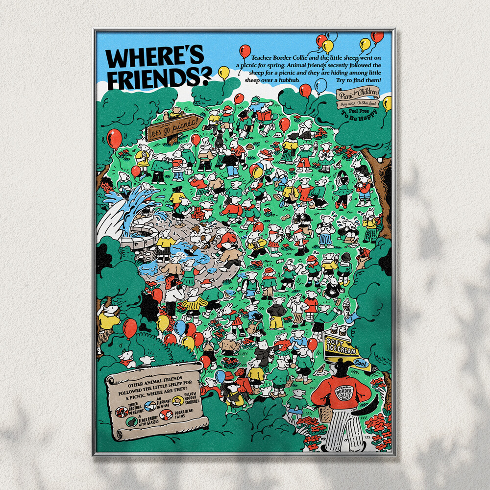 봄소풍을 떠난 꼬마 양들이 주인공인 포스터입니다. 꼬마 양들 사이사이에 몰래 소풍에 따라온 다른 꼬마들이 섞여있습니다. 숨어있는 친구들을 찾기위해 포스터를 꼼꼼히 보다 보면, 꼬마들이 봄소풍을 어떻게 보내고 있는지 볼 수 있습니다.