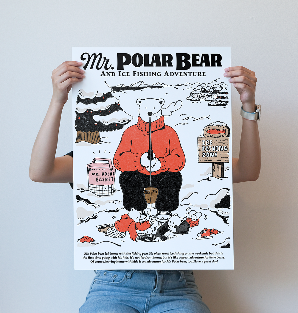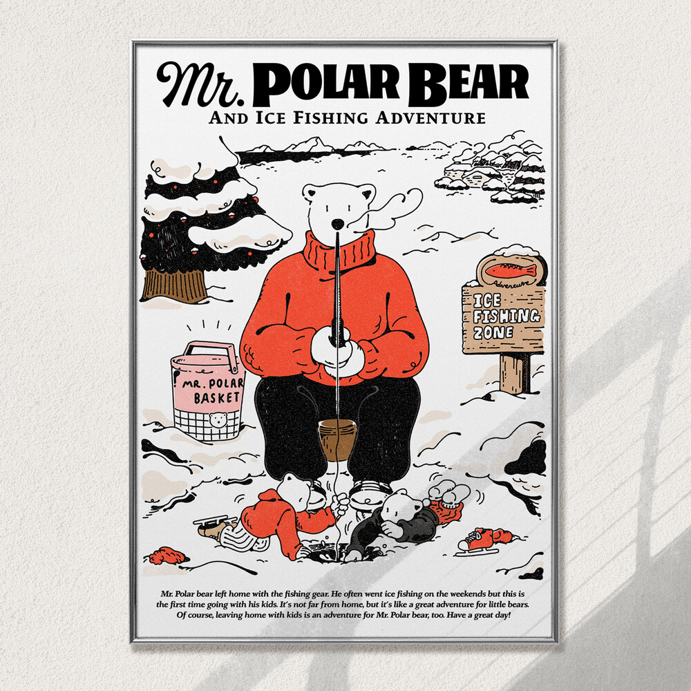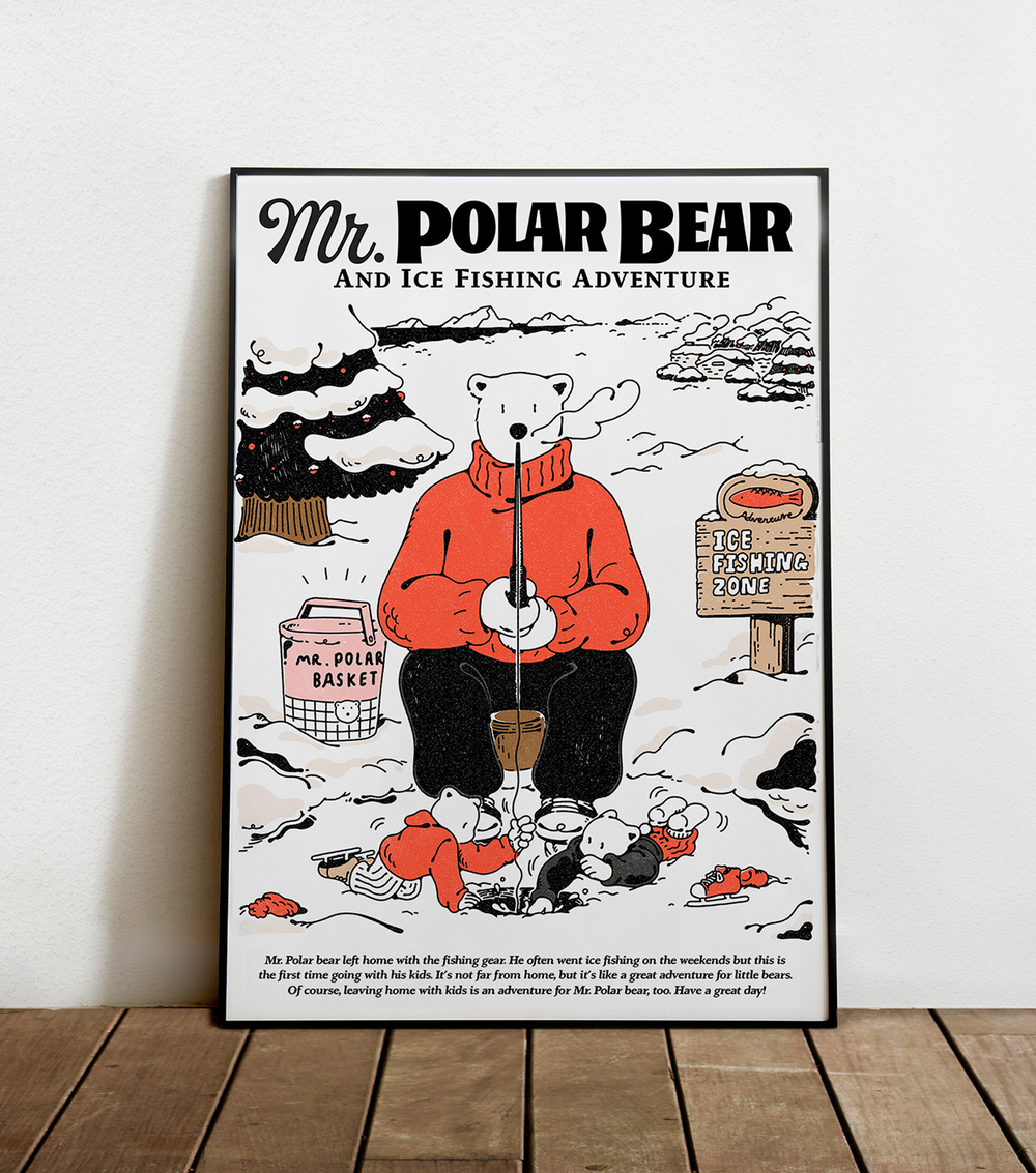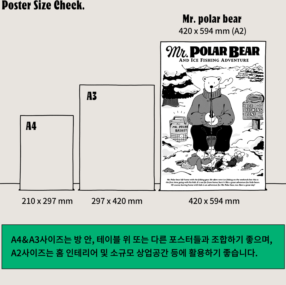 얼음낚시 대모험을 떠나는 폴라베어씨와 꼬마곰들이 주인공인 포스터입니다. 소풍만 관심 있고 아빠의 낚시에는 관심 없는 꼬마들이 포인트입니다. 겨울 무드를 더하고 싶을 때, 가족 일러스트를 두고 싶은 곳에, 그리고 특히 컬러 포인트가 필요한 곳에 두기 좋습니다.