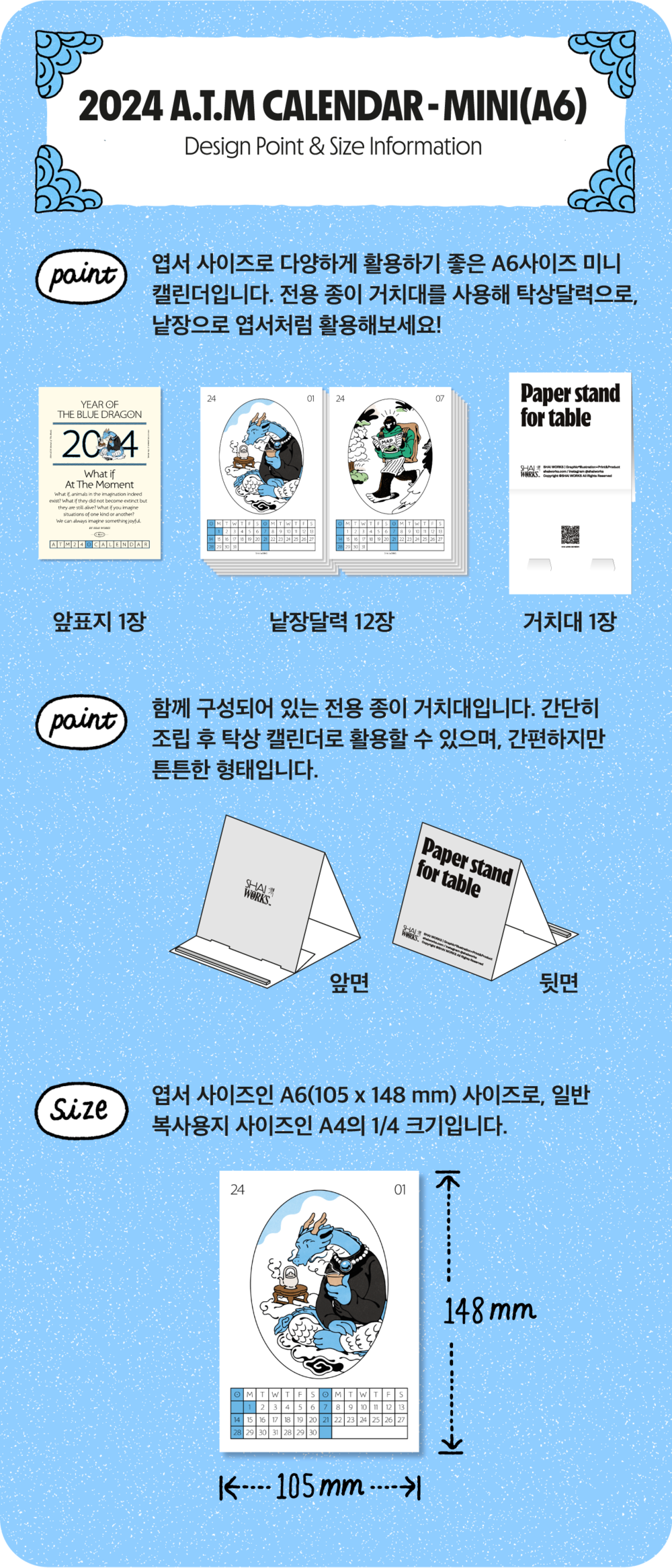 2024 A.T.M 캘린더 미니는 A6사이즈(105 × 148 mm)로, A4사이즈의 1/4 사이즈입니다. 엽서 사이즈로 다양하게 활용하기 좋습니다.