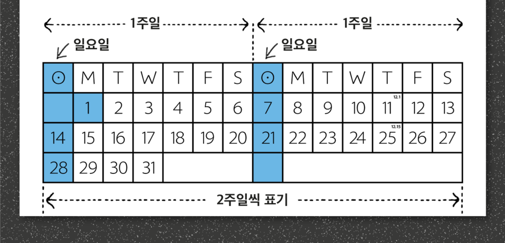 A.T.M 캘린더의 날짜는 2주일 단위로 표기합니다. 처음엔 조금 어색할 수 있지만, 익숙해지면 2주 단위 일정이나 연휴 등을 한 눈에 체크하기 좋습니다.