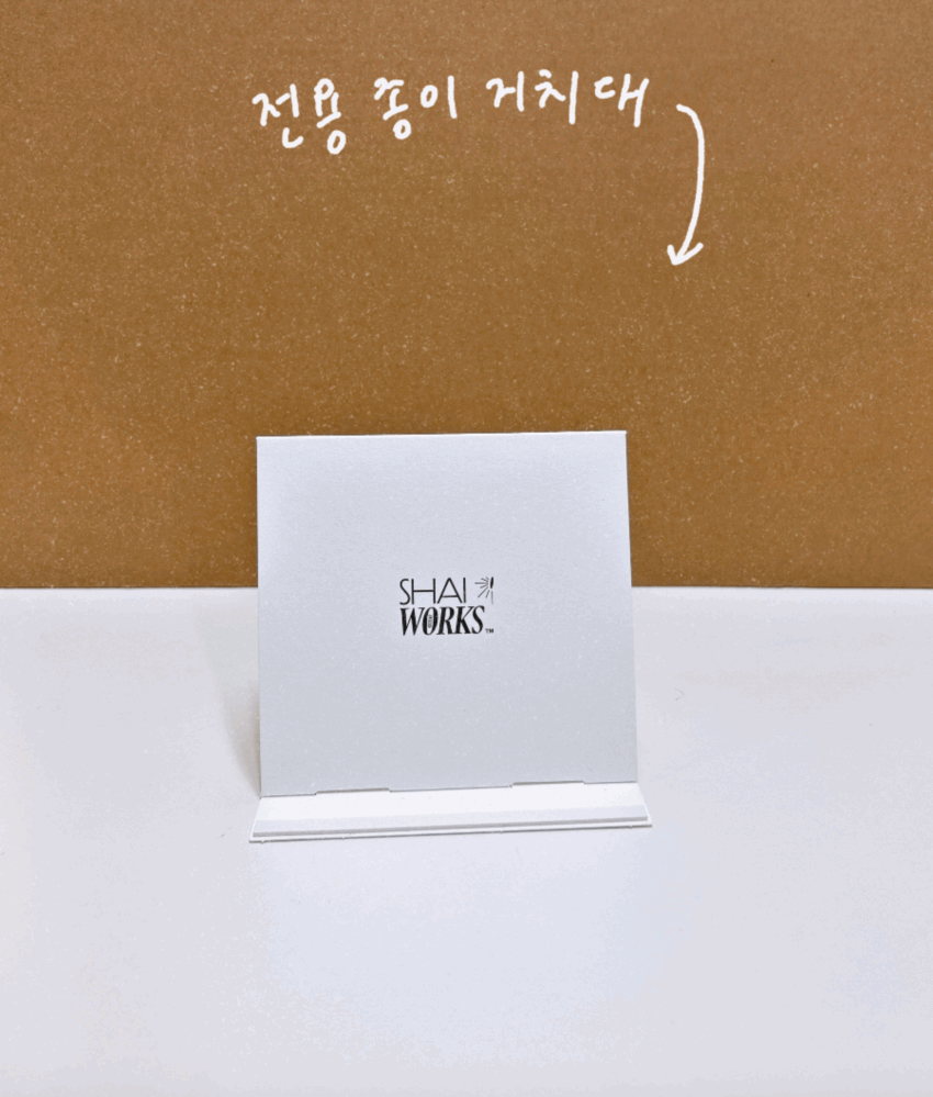함께 구성되어 있는 전용 종이거치대입니다. 거치대 앞면에 낮은 턱이 있어 종이를 거치해두면 탁상달력으로 활용하기 좋습니다.
