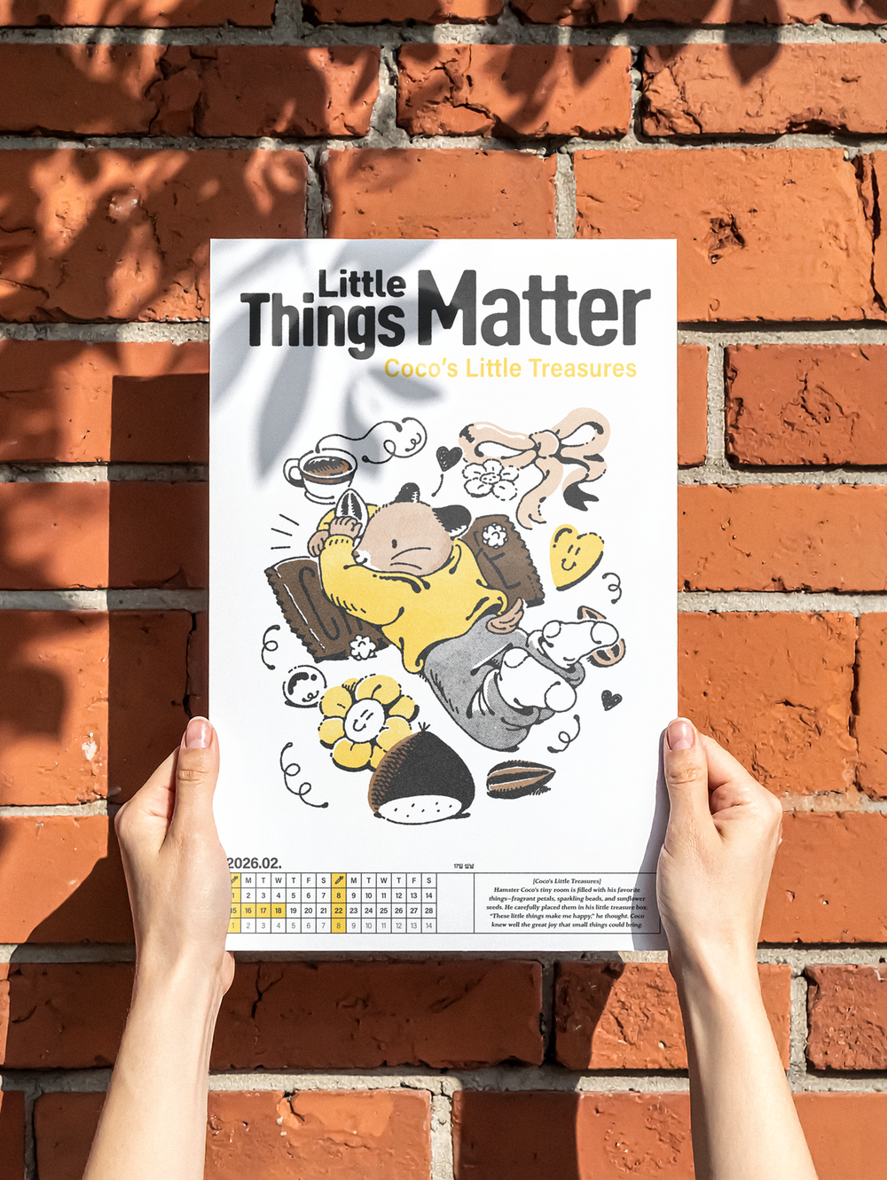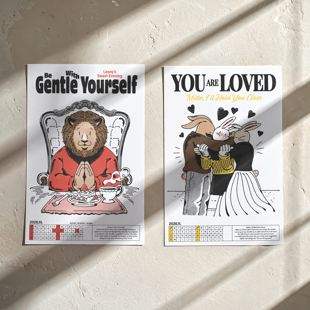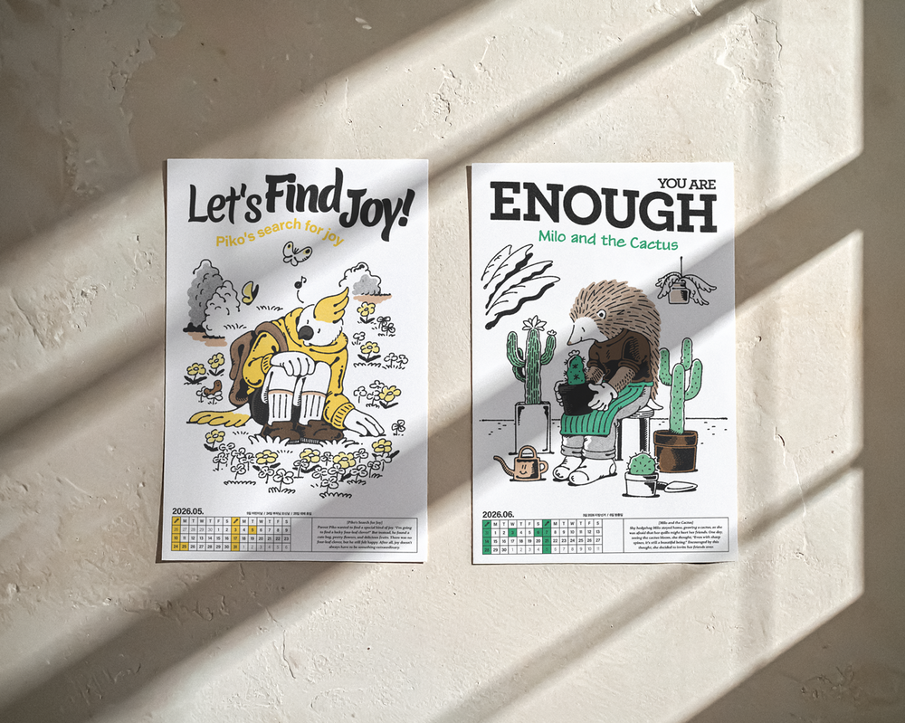 달력을 넘길때마다, 이 달의 마음가짐으로 삼으면 좋을 12가지의 짧은 이야기와 일러스트를 담은 캘린더입니다.