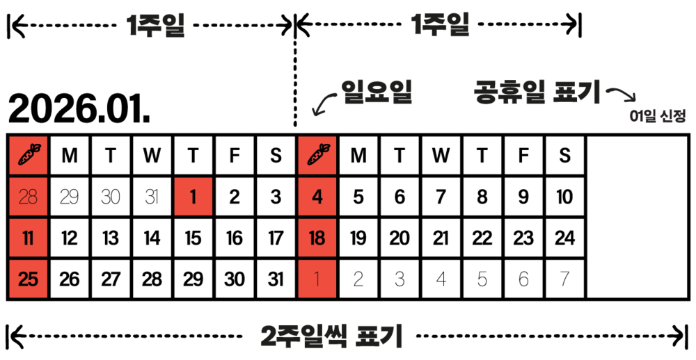 A.T.M 캘린더의 날짜는 2주일 단위로 표기합니다. 처음엔 조금 어색할 수 있지만, 익숙해지면 2주 단위 일정이나 연휴 등을 한 눈에 체크하기 좋습니다.