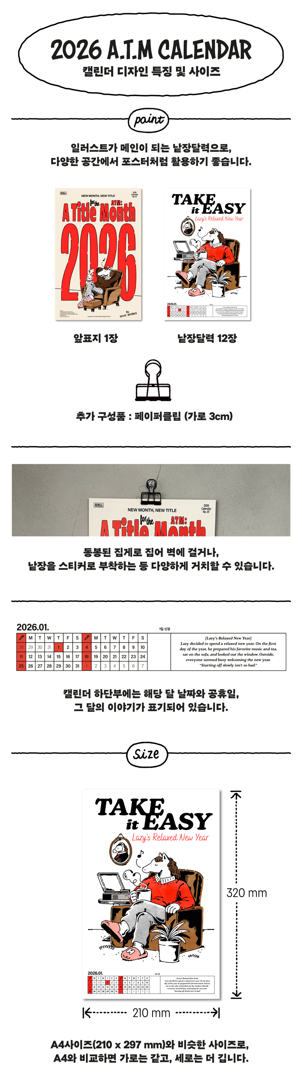 2026 A.T.M 캘린더는 210 × 320 mm로, A4사이즈와 비슷한 사이즈입니다. (가로 길이는 같고, 세로로 조금 더 길어요)