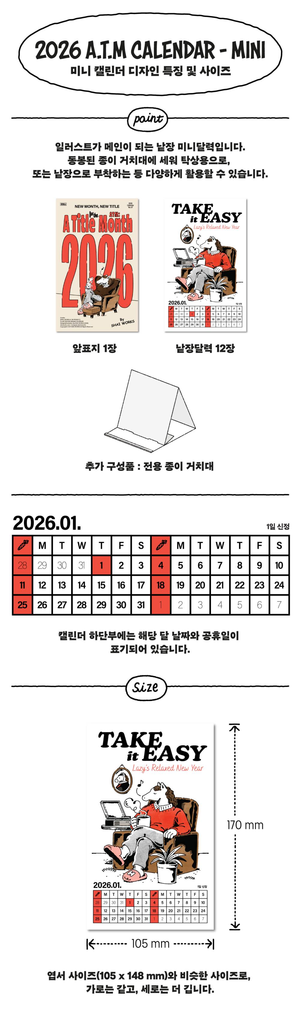 105 x 170 mm 미니 사이즈의 낱장 캘린더로, 동봉된 거치대를 활용해 탁상달력으로 활용할 수 있습니다.