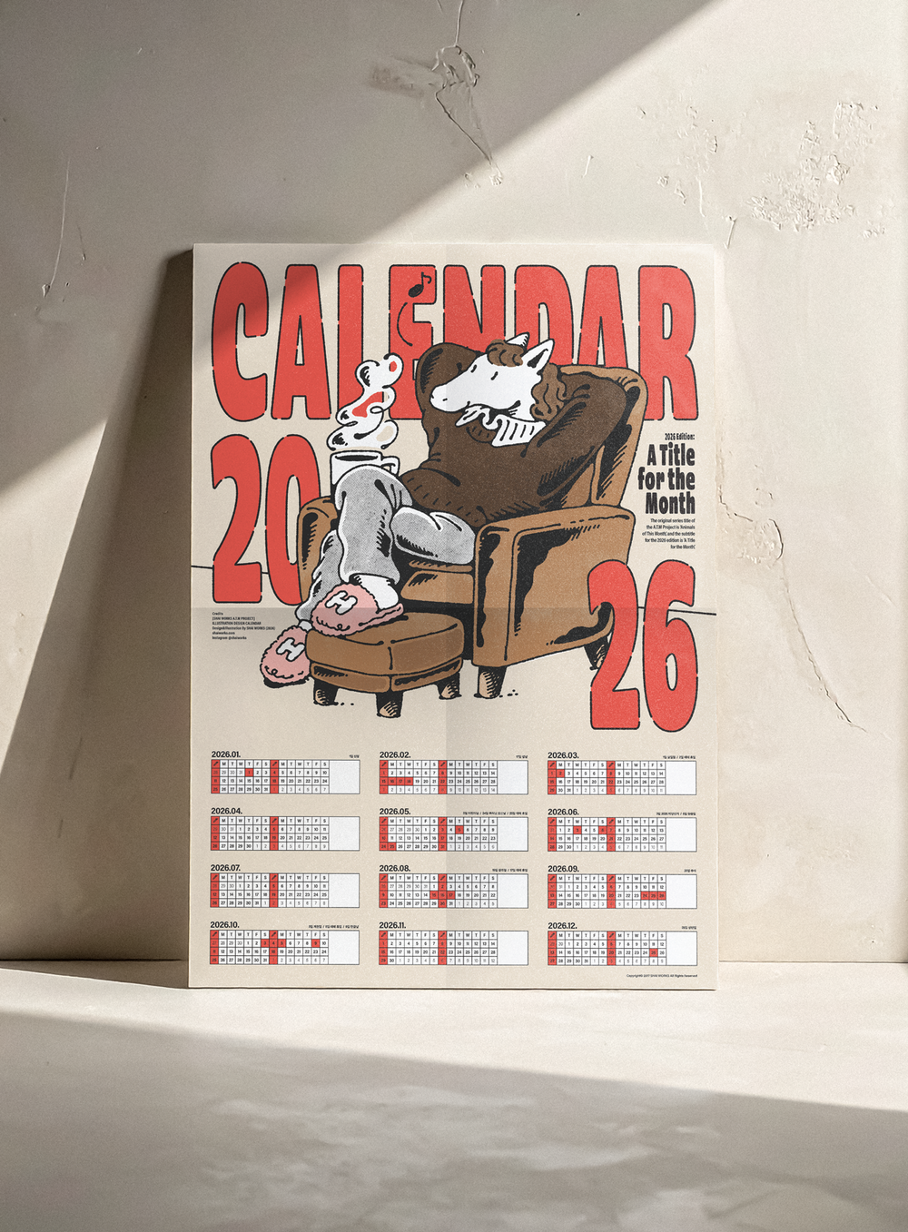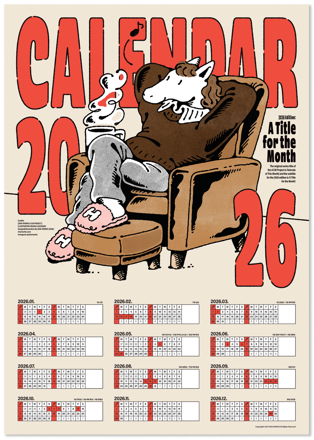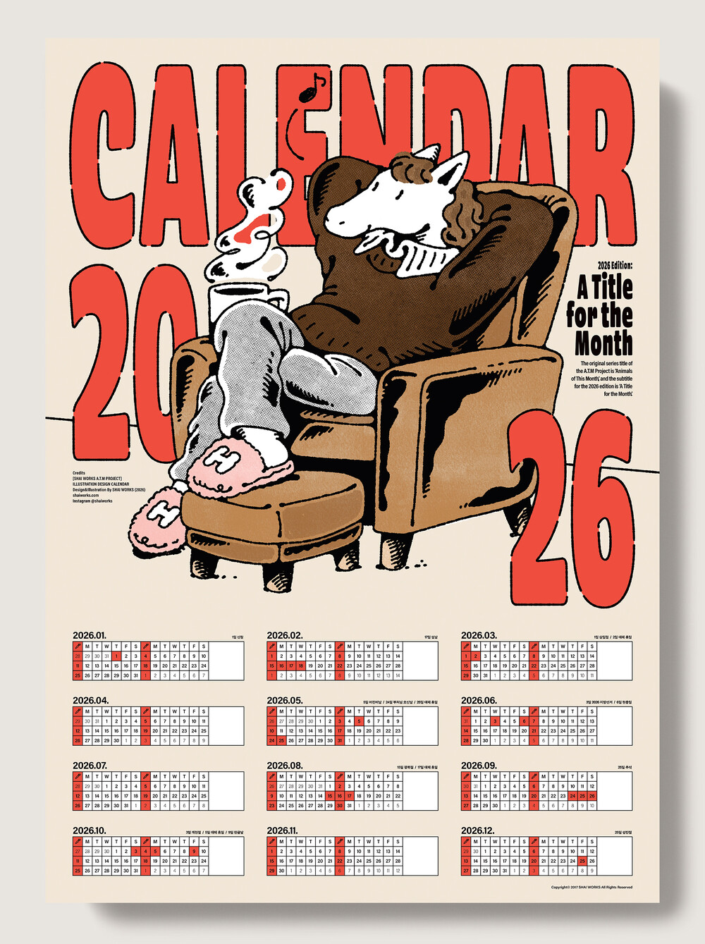 A2(420 x 594 mm) 사이즈의 포스터 달력입니다. 12달 날짜가 모두 표기되어 있어 1년을 한 눈에 볼 수 있는 연력으로, 1년동안 가까운 곳에 두고 자주 들여다보기 좋습니다. 일러스트와 컬러 타이틀이 공간에서 포인트를 주어 포스터로 활용하기에도 좋습니다.