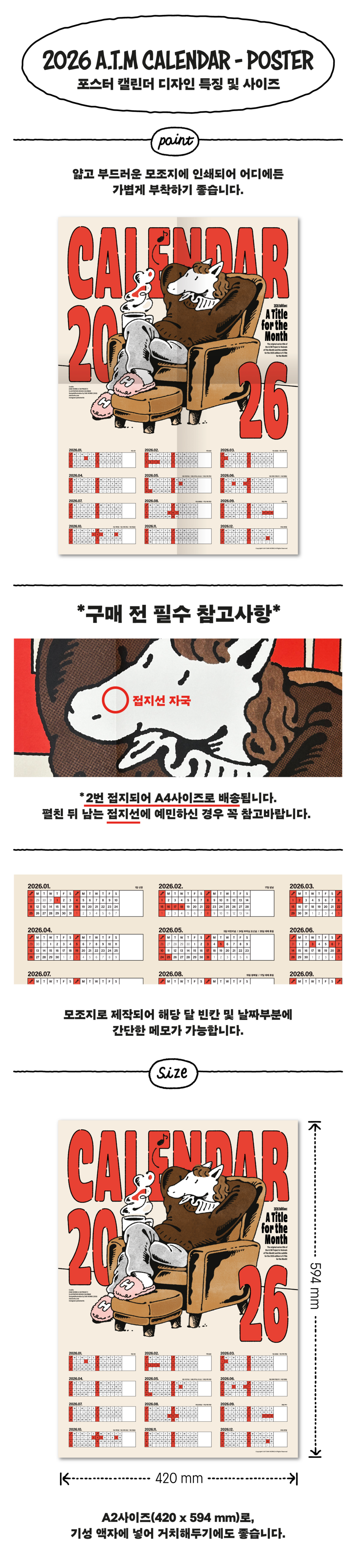 2026 A.T.M 캘린더-포스터는 420 x 594 mm로, A2사이즈입니다.