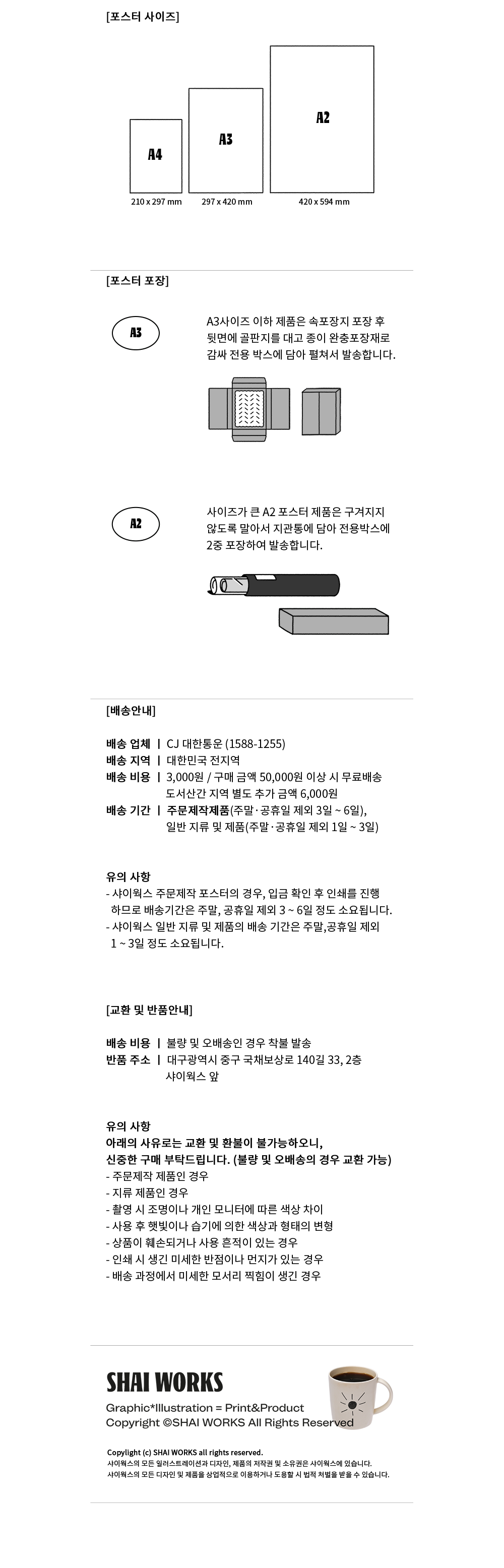 A3(297 x 420 mm), A2(420 x 594 mm)의 두가지 사이즈로 제작되어 테이블 위나 허전한 벽 등 어떤 공간에든 맞는 사이즈로 골라서 두기 좋으며, 다양한 사이즈의 다른 포스터들과 배치해두기 좋습니다.