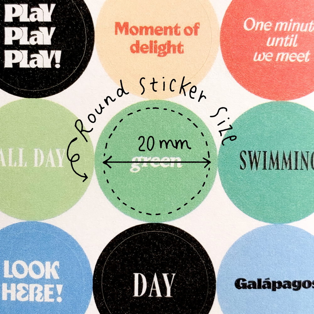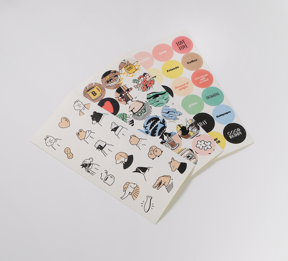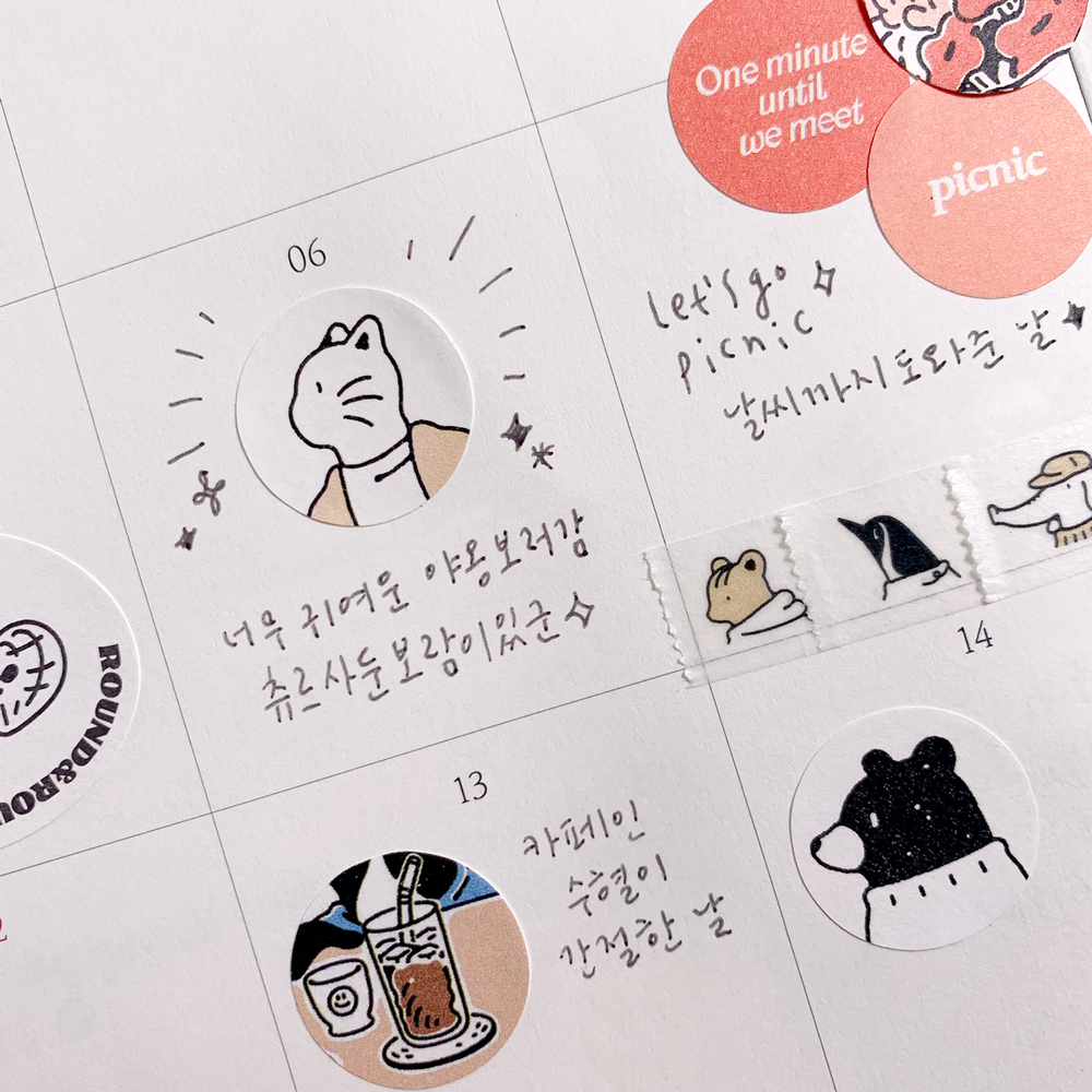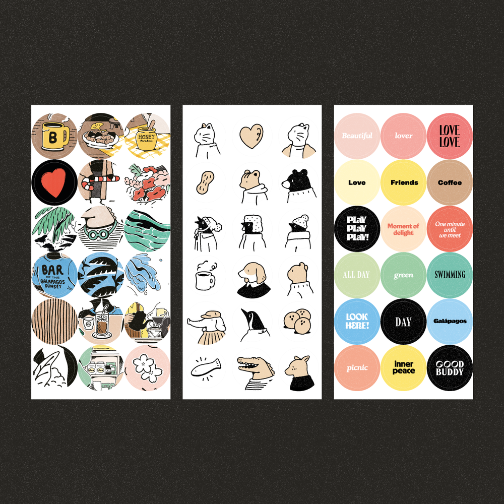 1장에 지름 2cm 라운드 스티커가 18개씩, 총 3장으로 구성되어 있어 여기저기 풍성하게 활용하기 좋습니다. 낱개로 사용해도 좋지만 어울리는 스티커끼리 조합하기에도 좋은 스티커입니다.