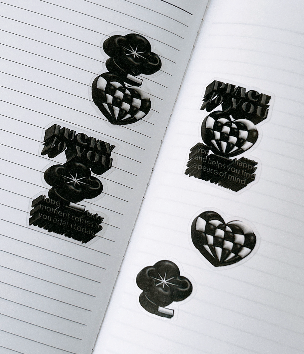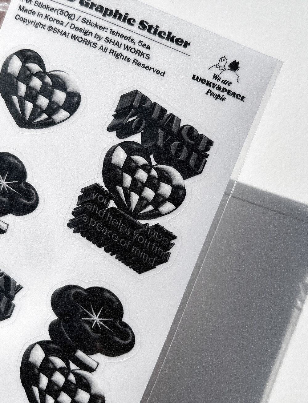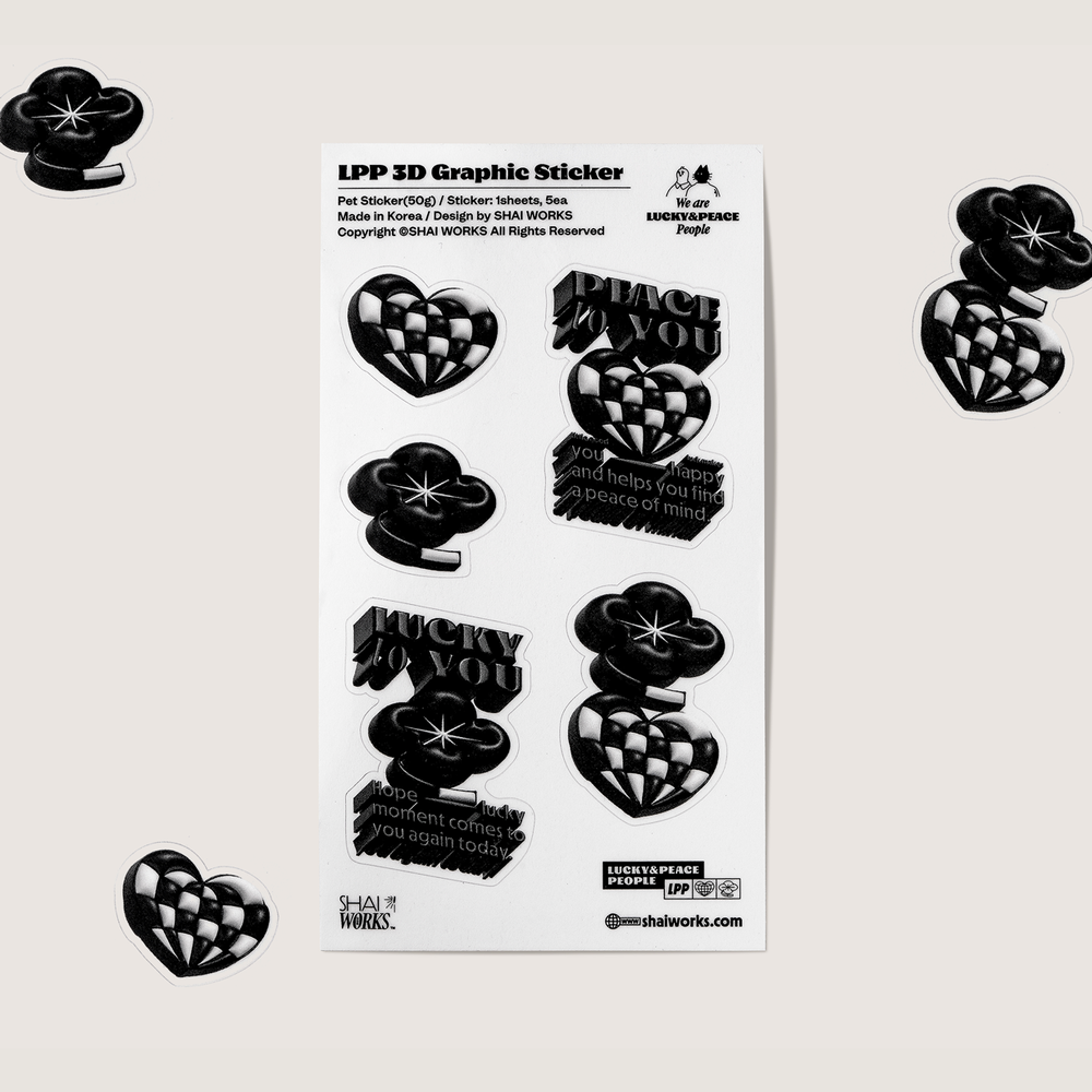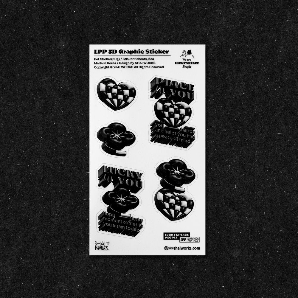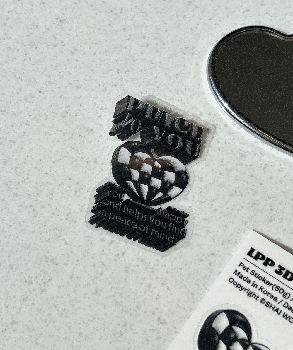 럭키, 피스, 피플의 아이콘을 3D 그래픽으로 만든 투명 스티커입니다. 볼록볼록한 그래픽과 메세지를 투명스티커로 제작해 입체감있는 이미지가 연출됩니다. 투명 패트지 유광 코팅으로 다양하게 활용할 수 있습니다. 메세지가 필요한 곳 어디에든 사용해보세요.