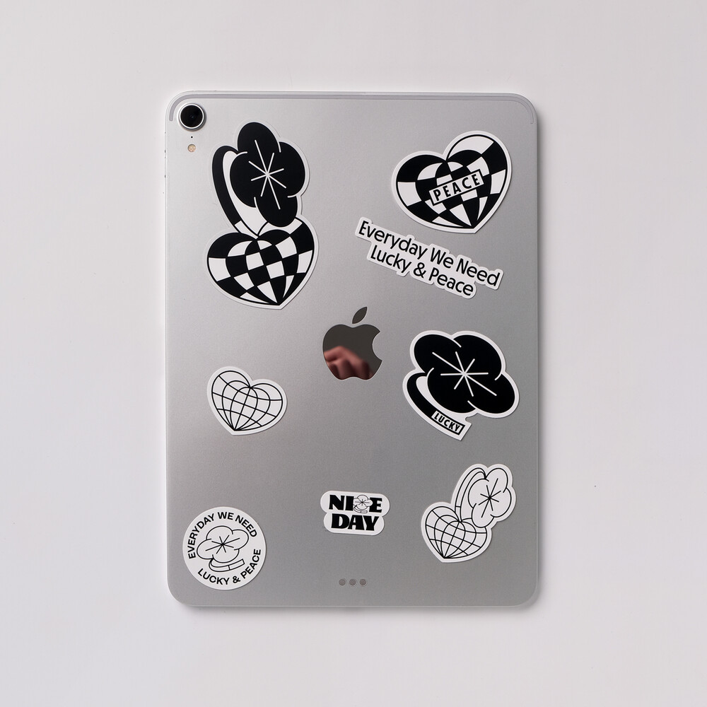 화이트, 블랙으로 심플하지만 포인트있게 제작해 여기저기 매력있게 사용할 수 있습니다. 전체 조각 스티커로 구성되어 있어 휴대폰, 노트북, 다이어리 등 어디든 편하게 부착할 수 있습니다. 매끄러운 면이나 핸드폰케이스 등에 붙여도 잘 부착되는 재질로, 어디든 붙이기 좋습니다. 코팅이 되어있어 장시간 부착하더라도 오염물이 잘 닦이는 편이라 자주 손이 닿는 곳에도, 오래 붙여 두고 싶은곳에도 좋습니다.