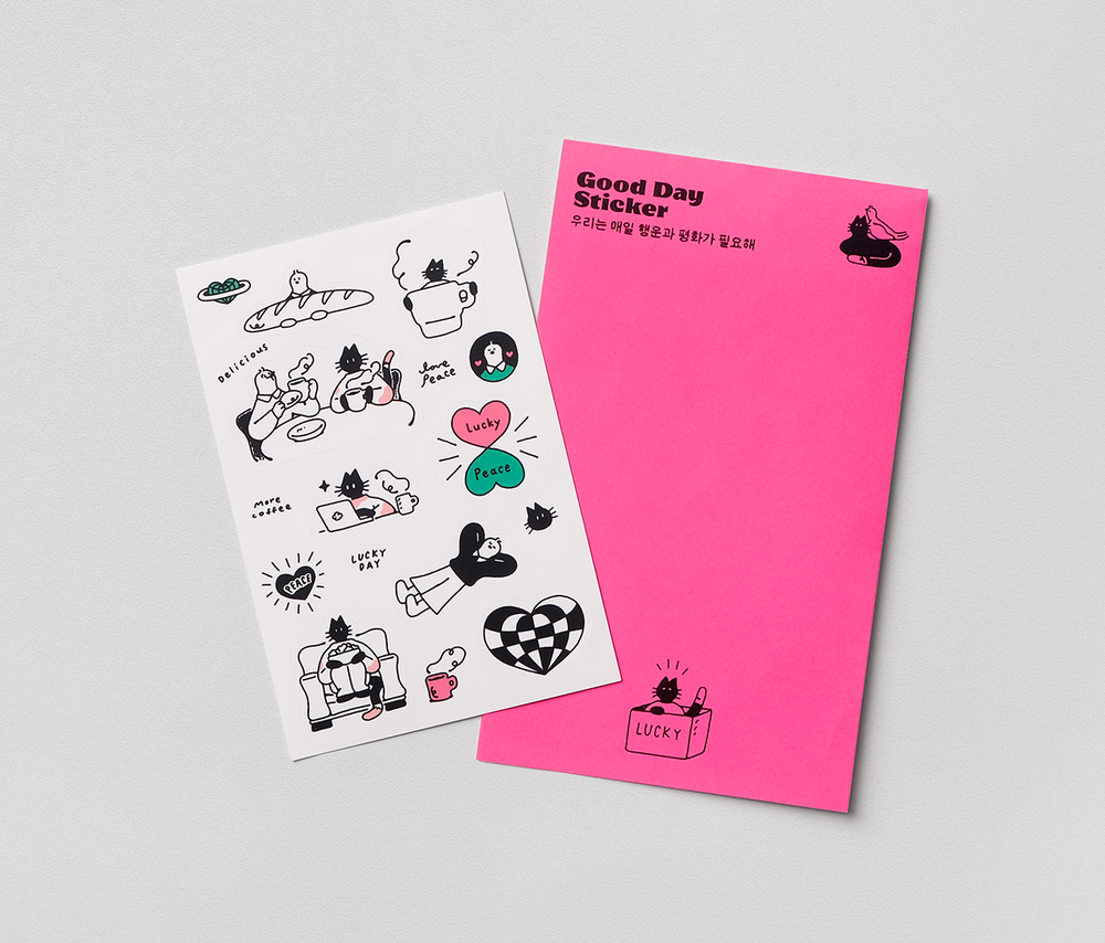LPP 멤버 흰비둘기 이너피와 삼색고양이 럭키테일의 일상을 모아놓은 스티커입니다. 먹고 마시고 일하고 쉬는 모든 날이 '굿데이'이기를 바라는 마음으로 만들었습니다. 오늘따라 유난히 맛있는 커피가, 잘 풀리는 업무가, 퇴근 후 재미있는 드라마가 모두모두 모이면 오늘이 '굿데이' 아니겠어요?