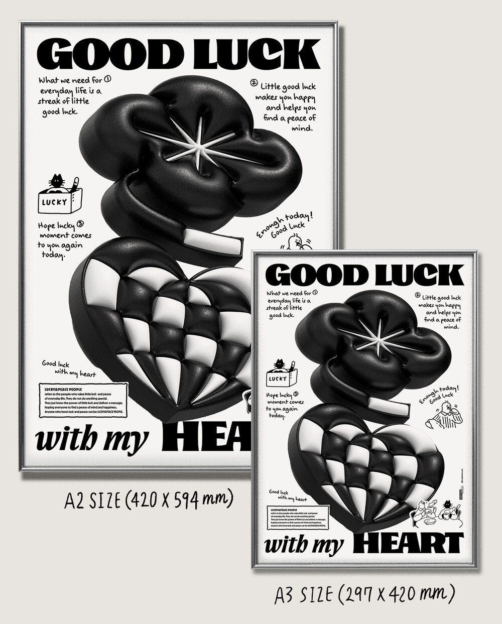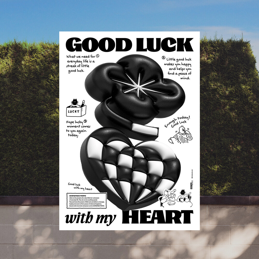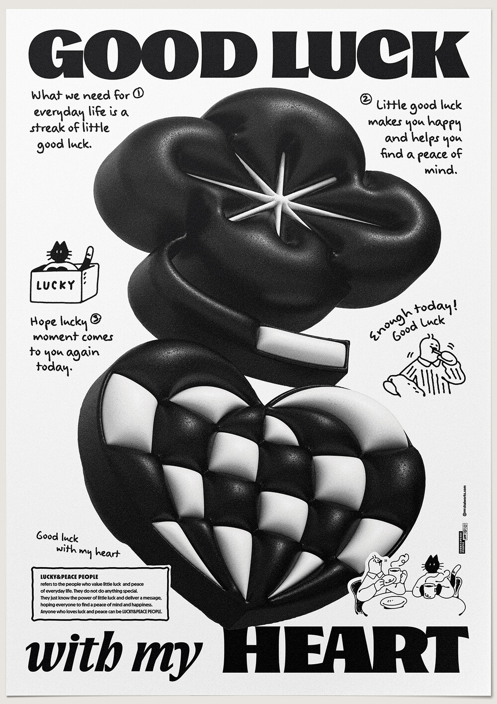 온 마음이 행운으로 가득하길 바라며 만든 3D 그래픽 포스터입니다. 행운과 평화의 아이콘을 입체감있는 3D 그래픽으로 만들어 보다 풍성하고 임팩트있게 표현하였습니다. 올록볼록 볼드한 그래픽에 귀여운 드로잉을 배치해 존재감 있는 포스터를 만들었습니다.