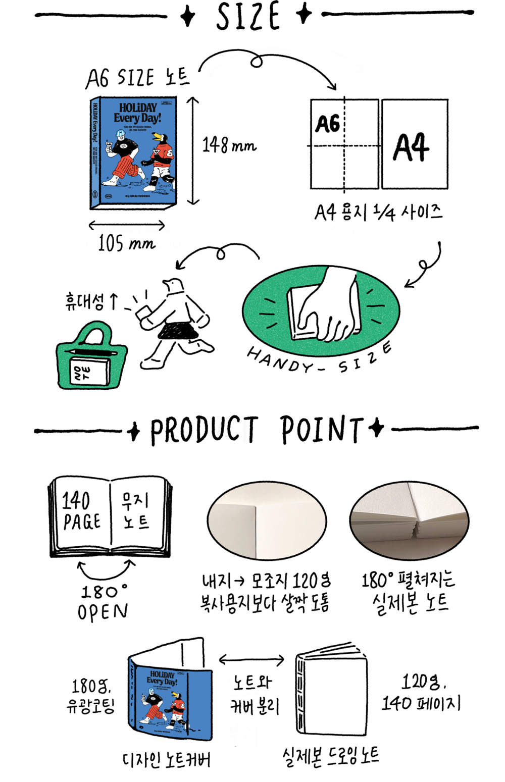 노트는 180도 펼쳐지는 실제본 노트로, 종이 커버를 따로 씌우는 방식으로 제작되었습니다. (노트와 커버 분리)
