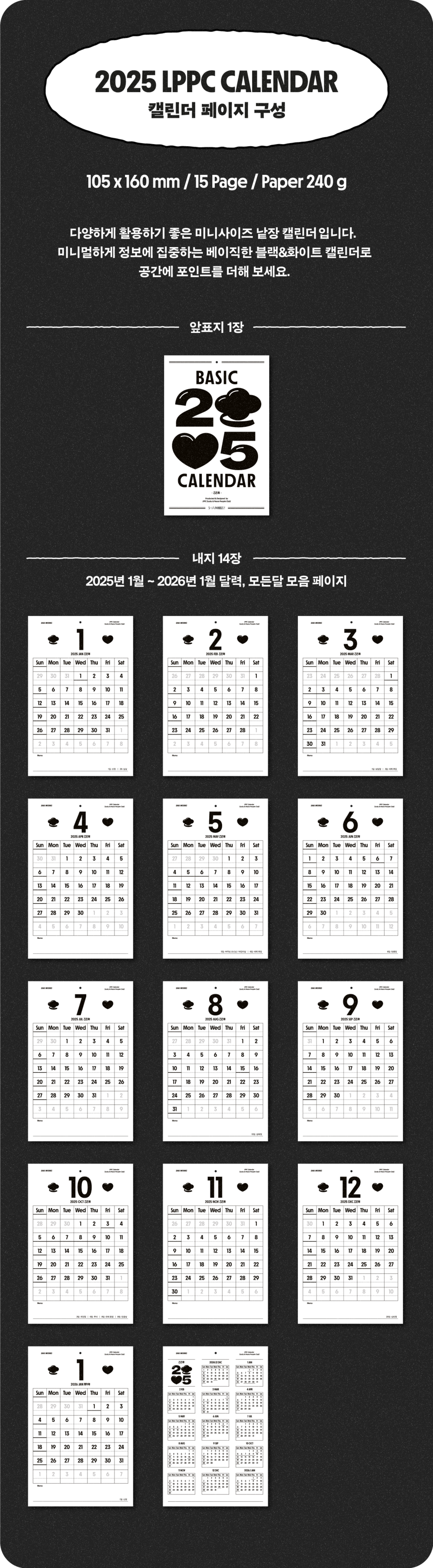 다양하게 활용하기 좋은 105 x 160 mm 사이즈의 미니 캘린더입니다. 앞표지 1장, 낱장달력 내지 14장, 총 15장으로 구성되어 있습니다.