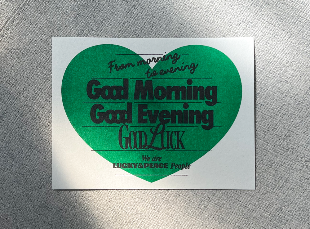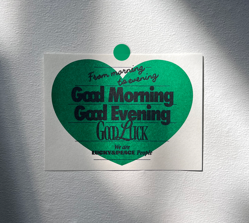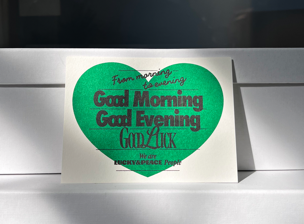 초록빛 평화를 가득 담은 하트 리소그라프 엽서입니다. 리소 인쇄 특유의 선명한 컬러와 큼직하게 들어간 메세지가 포인트입니다.