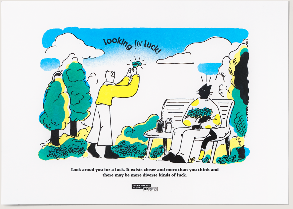 수없이 많은 클로버들 사이에서 네 잎 클로버를 만난 흰비둘기 이너피의 감격의 순간을 그린 포스터입니다. 럭키테일이 자기의 네 잎 클로버를 나누어주려고 해도 거절하고 노력한 보람을 느끼는 순간! 노력으로 얻어낸 행운의 아이콘, 이너피의 보물 1호가 될 예정입니다.