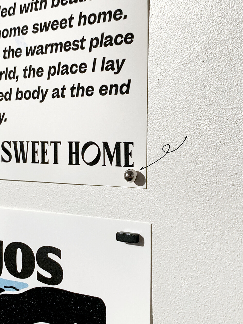 작은 엽서의 경우 1개의 자석으로 충분하며 297 x 420 mm 포스터의 경우 네 모퉁이에 자석 하나씩 4개로 고정할 수 있습니다.